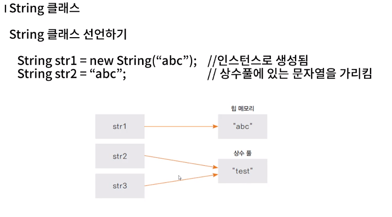 1234567891011String str1 = new String("abc");String str2 = "abc";String str3 = "abc";System.out.println(str1 == str2); //falseSystem.out.println(str1 == str3); //falseSystem.out.println(str2 == str3); //trueSystem.out.println(str1.equals(str2)); //trueSystem.out.println(str1.equals(str3)); //trueSystem.out.println(str2.equals(str3)); //truestr1 은 new연산을 이용해서 힙영역에 메모리가 할당이 되었고, str2, str3는 상수풀의 abc 값을 가르키고 있는 상태이다.